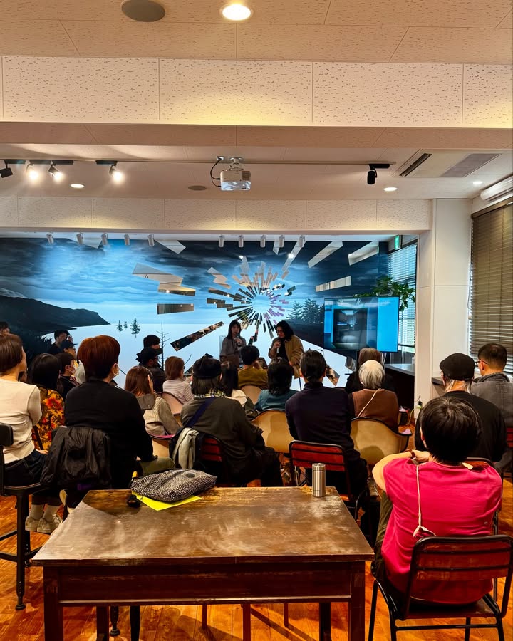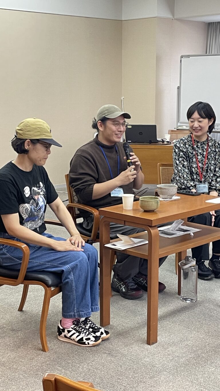 After joining a gallery tour of the exhibition “Fukuoka Asian Art Museum Best Collection Ⅲ Breaking the Conventional: New Self-Portraits” led by the museum volunteers, Shindo was invited to a welcome party in the meeting room.