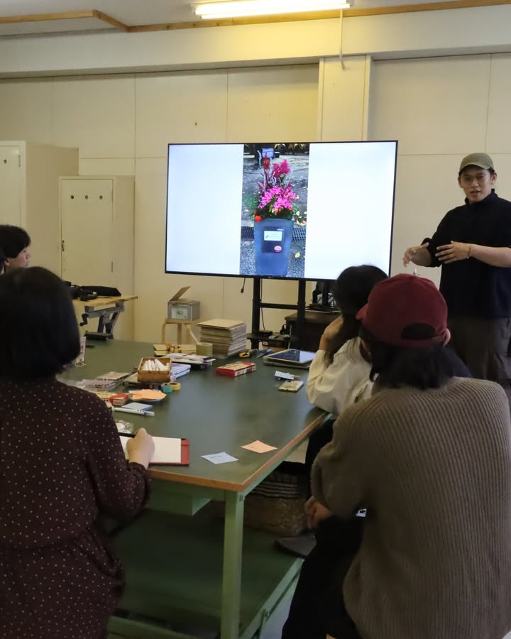 After giving a self-introduction, Chen requested participants to pick three words that came to mind when they think of Fukuoka. In the next step, everyone went out to take photos and record sounds. They returned to the studio with something they picked up outside, such as fallen leaves and bags of finished snacks, and pasted these objects on thick paper. While making art, each of them shared their thoughts with the pictures and sounds they took.