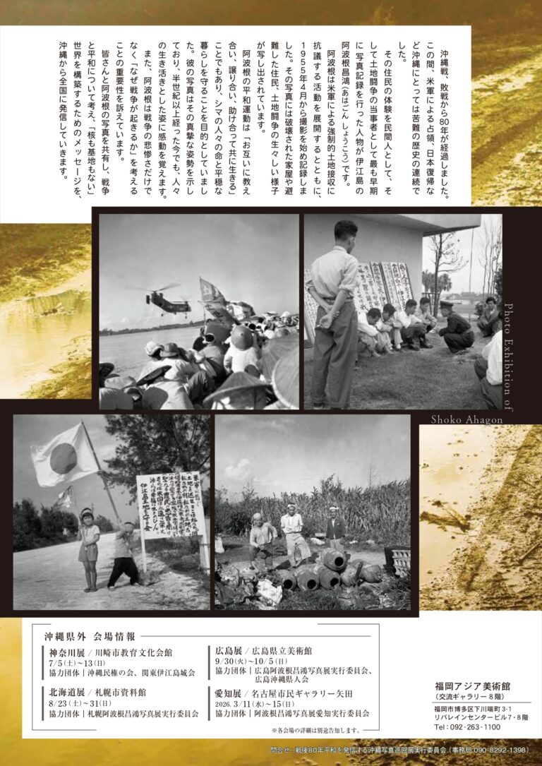 1953年から始まった沖縄・伊江島での米軍の銃剣とブルドーザーによる強制的な土地接収に対し、住民運動のリーダー・阿波根昌鴻(あはごん・しょうこう)さんは、非暴力による抵抗運動を展開し、「伊江島のガンジー」と呼ばれた。彼は1955年4月から約10年間、島に1台のカメラで住民の被害の様子やテント生活を撮影し、約3200点の写真を残した。その中から新たに制作されたデジタルプリント約400点を展示する。