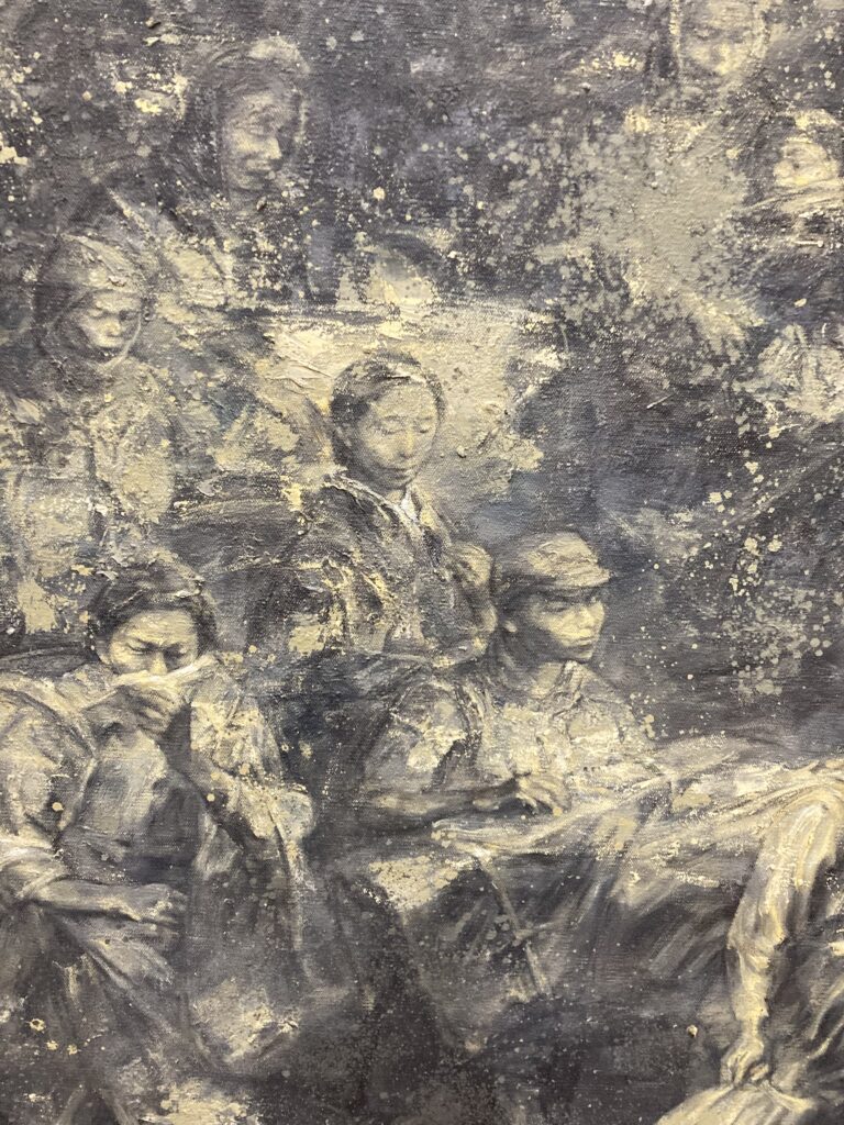 「一九四六」は高さ3m×長さ20mという巨大絵画です。そこには旧満州(現在の中国東北部)での辛く厳しい冬を生きのびて、祖国への引揚船に向かう日本人の姿が描かれています。国内外の情勢の変化によって、旧満州からの引揚げが始まったのは1946年春のことでした。王氏はネットで見た「骨箱を抱えた男装の少女」に心を動かされ「戦争で苦しむのは、いつの時代も弱者だ」とこの絵画制作を決意されました。