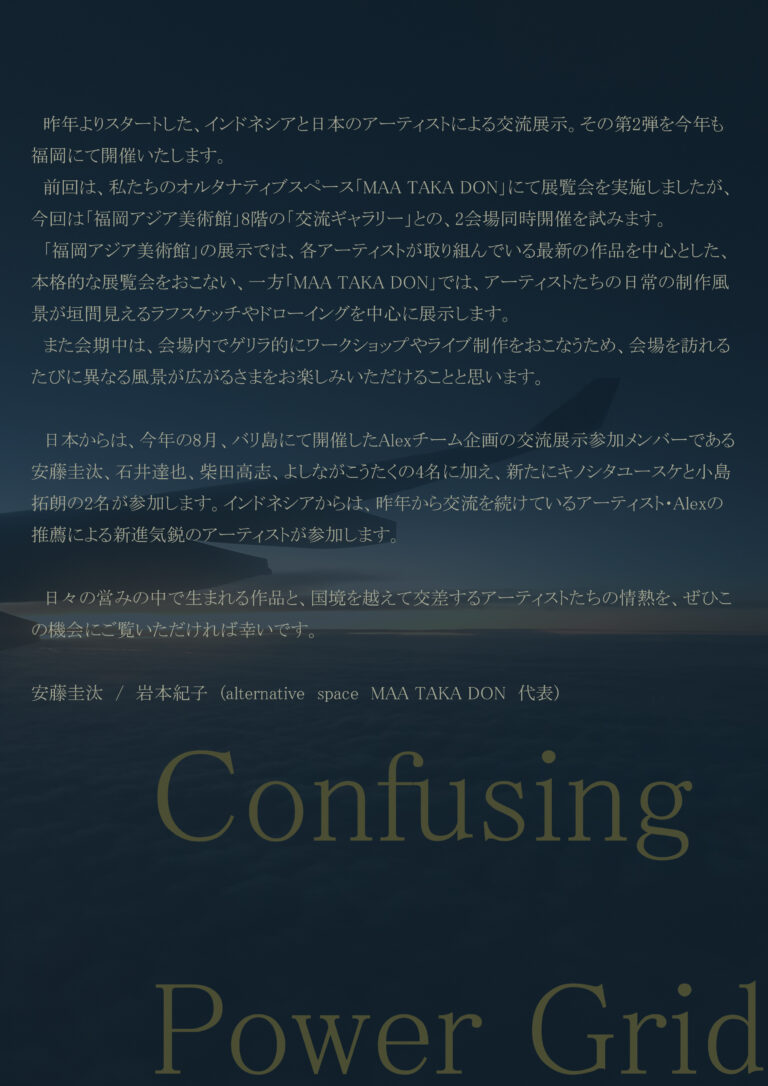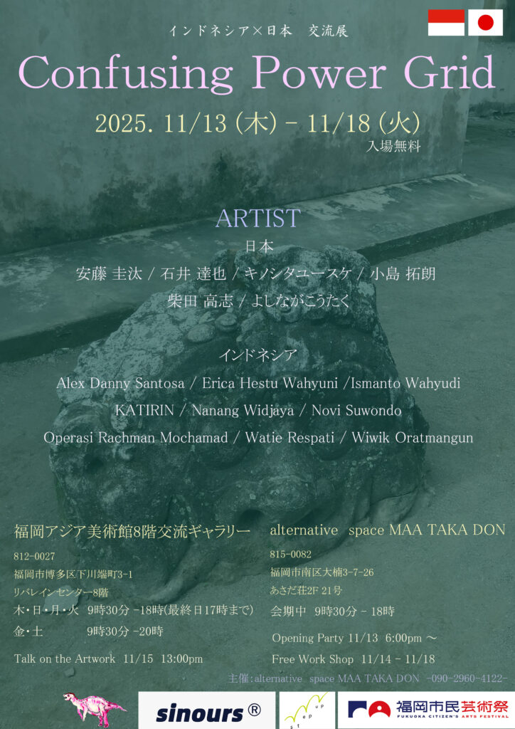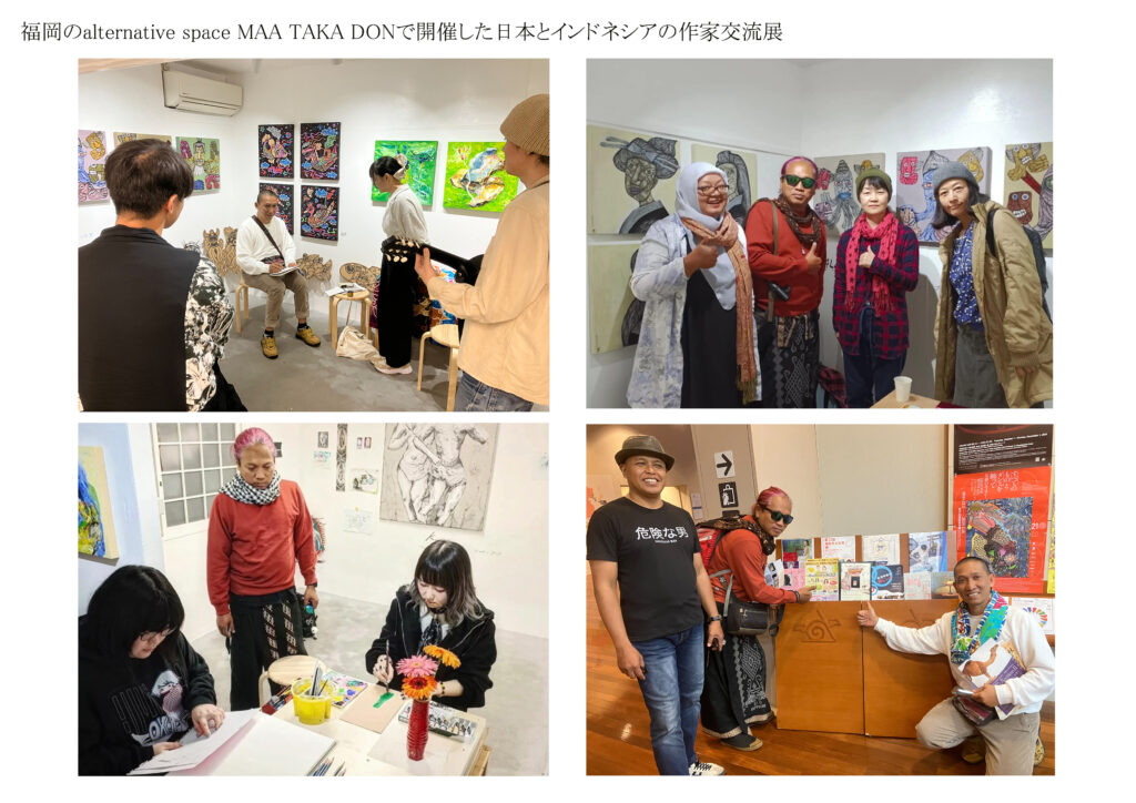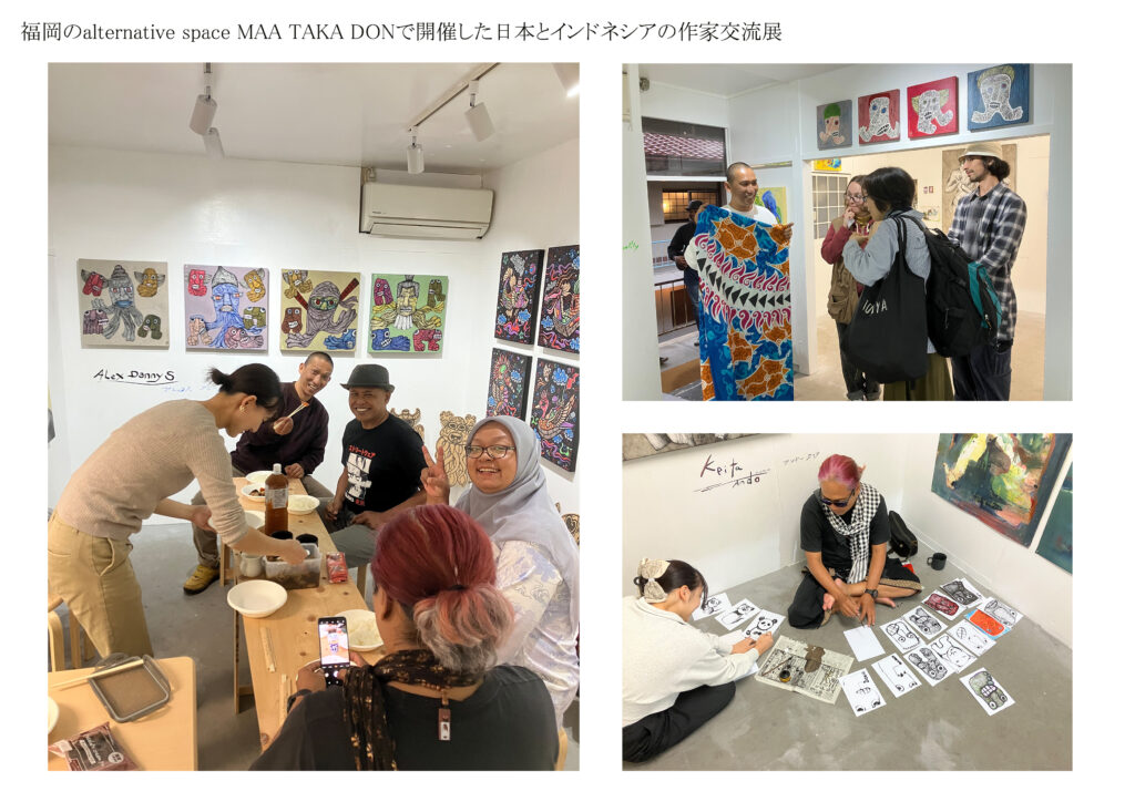 昨年より始まった、インドネシアと日本のアーティストによる交流展示。その第2弾を、今年も福岡で開催いたします。前回はオルタナティブスペース「MAA TAKA DON」での展覧会でしたが、今回は新たに福岡アジア美術館8階・交流ギャラリーを加え、2会場同時開催として展開します。福岡アジア美術館では、各アーティストの最新の取り組みを紹介する本格的な展示を実施。一方「MAA TAKA DON」では、制作過程を感じられるラフスケッチやドローイングを中心に、滞在中のアーティストによるワークショップやライブ制作など、日々変化する空間をお楽しみいただけます。出展作家は、8月にバリ島で開催された交流展に参加した安藤圭汰、石井達也、柴田高志、よしながこうたくに加え、新たにキノシタユースケと小島拓朗が参加。インドネシア側からは、昨年より交流を続けるアーティストAlex Danny Santosaの推薦による注目のメンバーが集います。国境を越えて交わる表現と情熱、その共鳴の瞬間をぜひご覧ください。