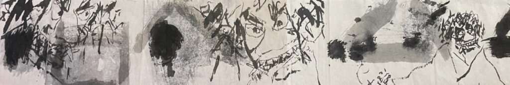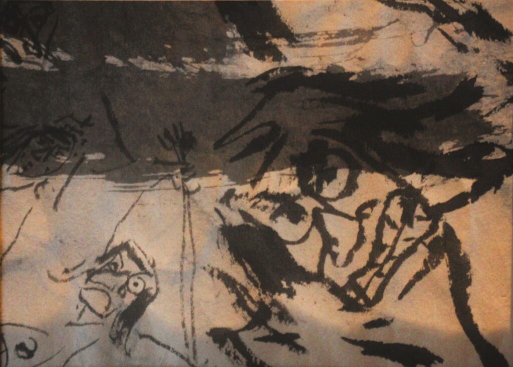 「宮崎神楽画巻(高見乾司が描き溜めた神楽の絵)」、「神楽笛が聞こえる(神楽を伝える村の風景に仮面を配したコラボ)」神楽と仮面の民俗誌(高見剛の神楽取材による仮面と神楽の写真)等を組み合わせて構成される企画展です。