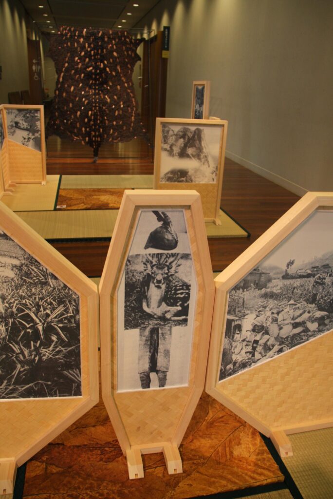 かつて博多と台湾を行ききした博多商人は、台湾の珍しい風物をとりいれた家具で部屋を飾ったという。その部屋をイメージした、台湾の古い風景写真を使った屏風とバナナの皮で作った鹿皮風絨毯による不思議な空間!